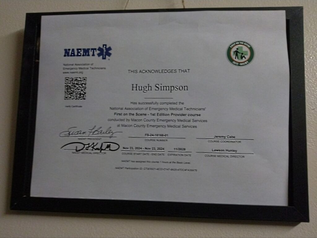 I’m a trained National Association of EMTs First On The Scene Responder, which is a FREE intense four hour course offered by local EMS and fire departments. Strongly suggest you take this course!